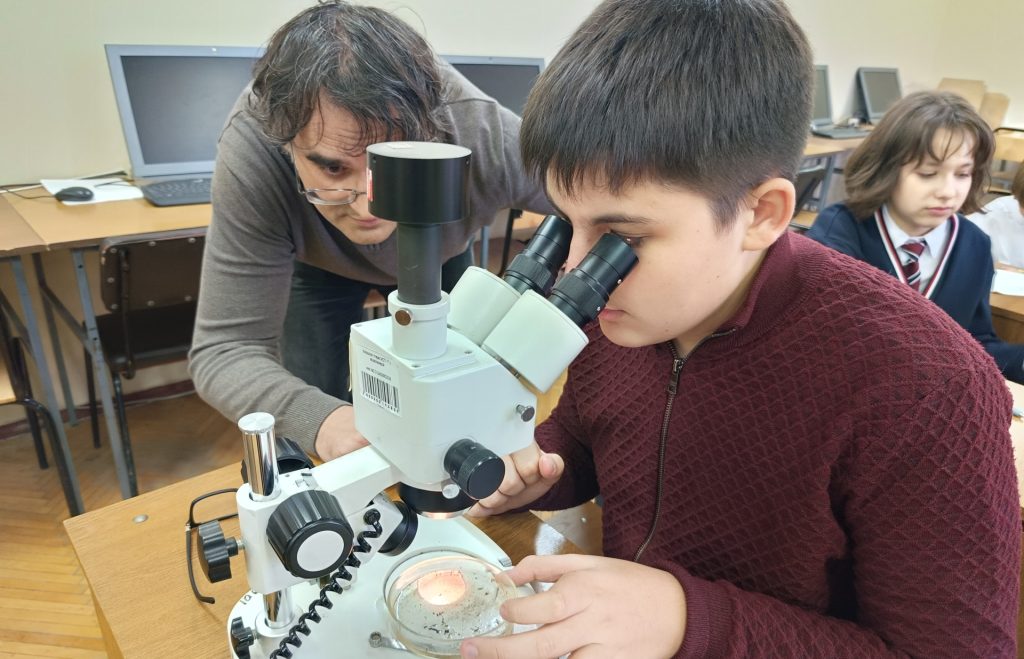 Евграфов А.В. в лаборатории кафедры Экологии познакомил учащихся естественнонаучной вертикали с удивительным микромиром — школьники впервые увидели циклопов, дафний, коловраток и других существ, научились их идентифицировать и проводить на основе их количественного состава биоиндикацию водных источников.
